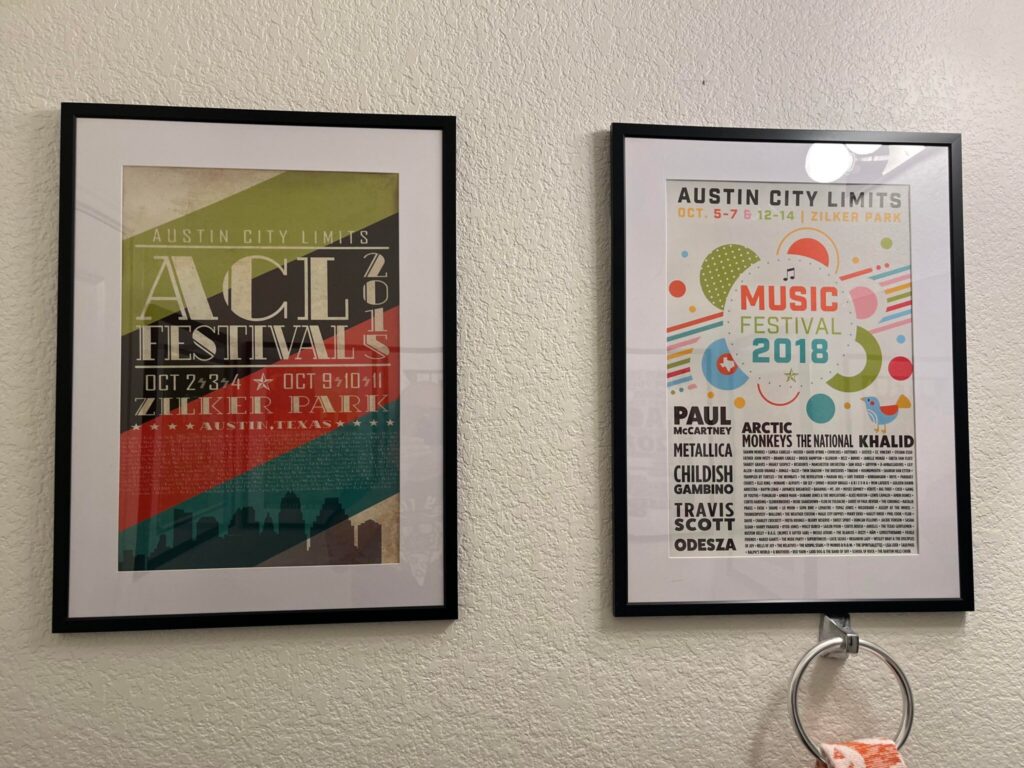Two framed Austin City Limits posters — one from 2015 and a colorful 2018 music-festival print — are doing the heavy lifting in this guest bathroom, turning a small wall into a full-on ACL shrine.