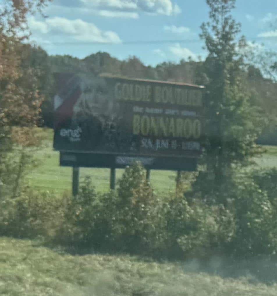 A photo shared on r/bonnaroo shows a roadside billboard on I-24 east just before Manchester advertising Goldie Boulitier at Bonnaroo this Sunday. The sign features large “BONNAROO” lettering with the artist name above it; the image is low quality because the photographer was driving.