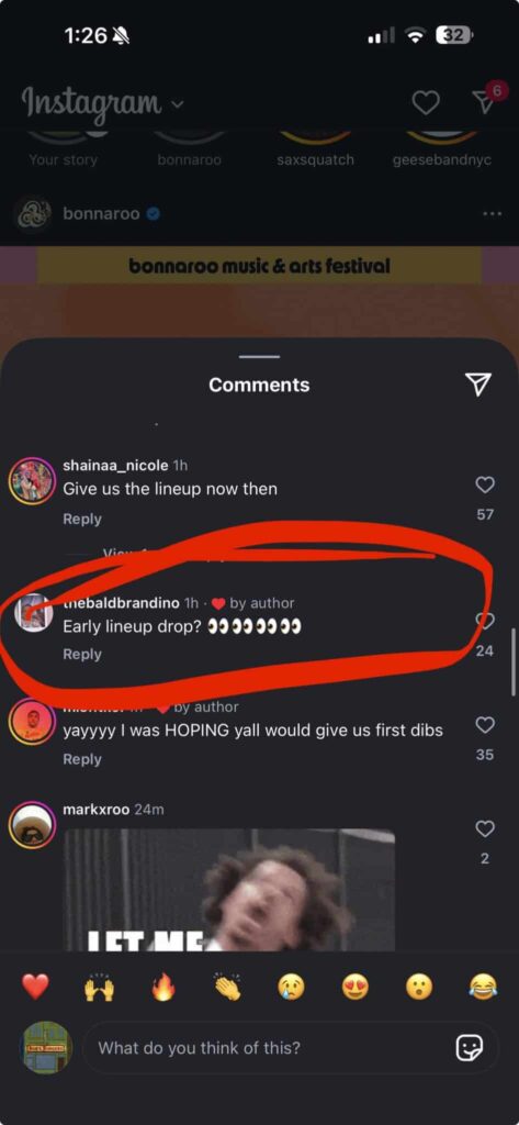 Source: https://www.reddit.com/r/bonnaroo/comments/1oq8gca/omg_bonnaroo_liked_this_comment_on_instagram/