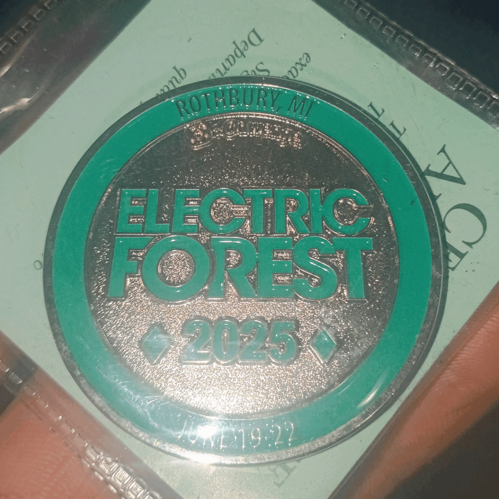 A photo shared to the Electric Forest subreddit shows a new 2025 commemorative coin bearing the festival’s name. The round metal medallion features bold, stacked “ELECTRIC FOREST” lettering, a prominent “2025” and a turquoise outer ring — with “ROTHBURY, MI” stamped along the top edge.