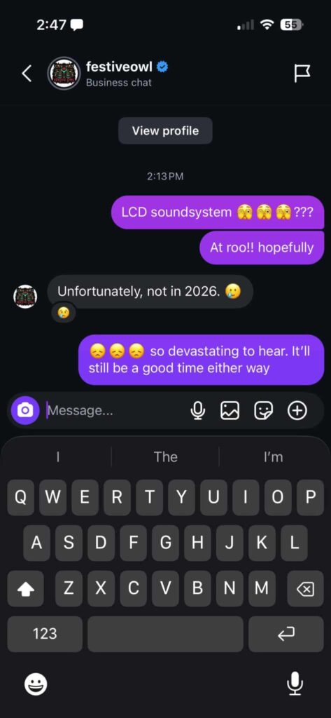 Fan DM Screenshot Shows Festival Account Saying “LCD Soundsystem — Not in 2026”