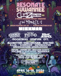Resonate Suwannee, held May 15–17, 2025, is known for its diverse mix of electronic, jam, and funk acts, with STS9 headlining alongside Detox Unit, Shpongle, Papadosio, Lotus, Opiuo, and Beats Antique at the Spirit of the Suwannee Music Park in Live Oak, Florida.