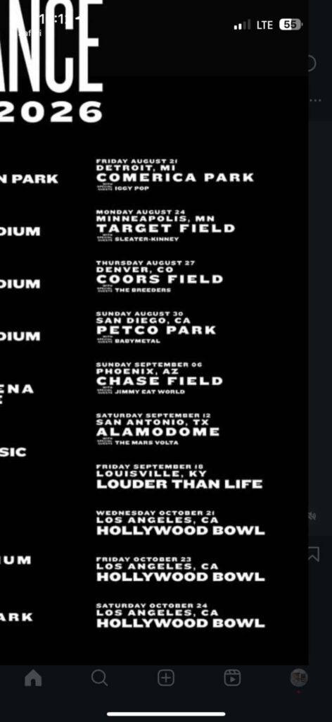 An image circulating online lists a set of alleged My Chemical Romance North American dates for 2026. The slate mixes stadium stops with festival appearances and a multi-night run at the Hollywood Bowl.