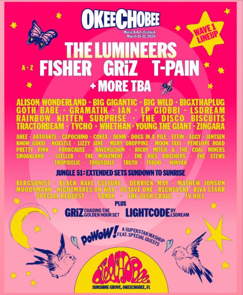 Okeechobee Music & Arts Festival has released wave one for March 19–22, 2026 at Sunshine Grove in Okeechobee, Florida. Headliners include The Lumineers, Fisher, GRiZ and T‑Pain — with more acts still to come.