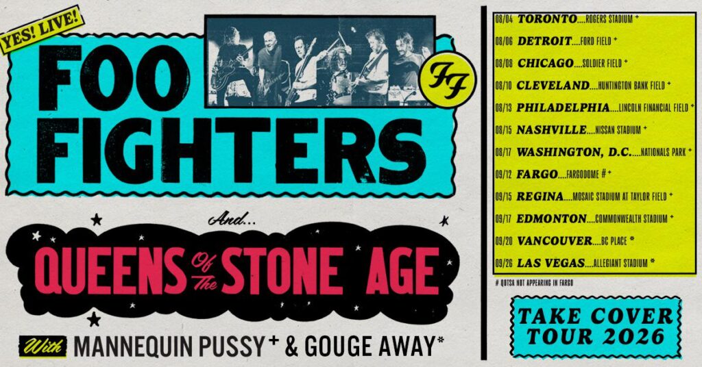 A promotional poster shared on Reddit’s r/governorsball is circulating online that appears to advertise a Foo Fighters “Take Cover Tour 2026” run with Queens of the Stone Age listed as co-headliners and support from Mannequin Pussy and Gouge Away. The image includes a North American stadium routing and a small footnote about Queens of the Stone Age’s Fargo appearance.
