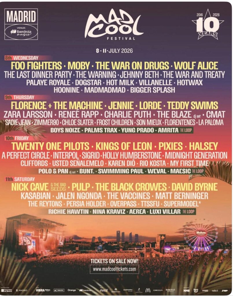 A poster shared to r/outsidelands shows a four-day Mad Cool Festival in Madrid running July 8–11, 2026 with a stacked roster printed across each day. The image — which has been widely reposted across festival forums — lists major headliners including Foo Fighters, Florence + The Machine and Twenty One Pilots, with a Saturday bill that reads like a British indie dream: Nick Cave & The Bad Seeds, Pulp, The Black Crowes and David Byrne among them.