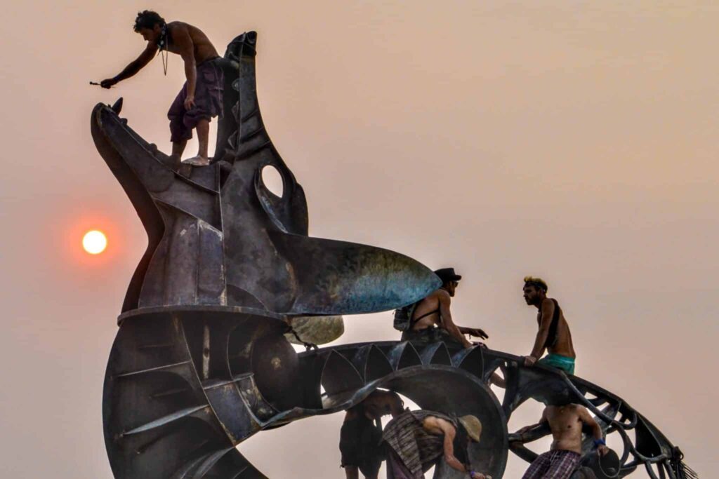 The photo is a reminder of the dual nature of interactive festival art: it invites play and perspective, but it also demands respect and caution. Over the years crews, volunteers and event organizers have tightened protocols around climbing and interacting with large works — for good reason.
