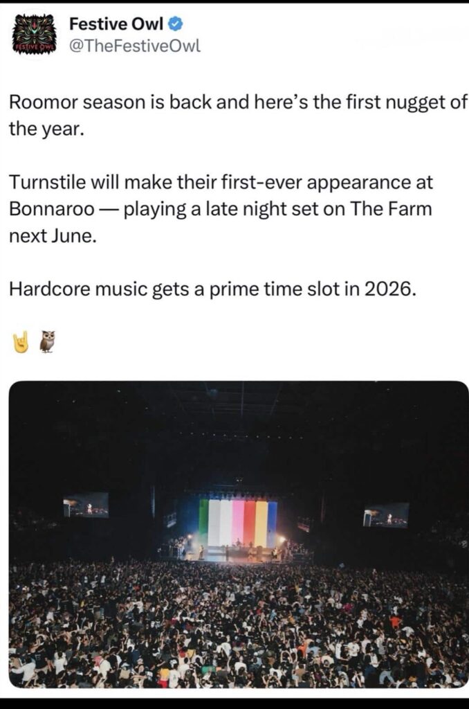 “Roomor season is back and here’s the first nugget of the year. Turnstile will make their first-ever appearance at Bonnaroo — playing a late night set on The Farm next June. Hardcore music gets a prime time slot in 2026.”