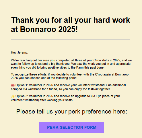TennesseeBonnaroo Bonnaroo offers perks to C’roo volunteers — comped GA for a friend or GA+ upgrade for 2026 November 26, 2025 View Full Post