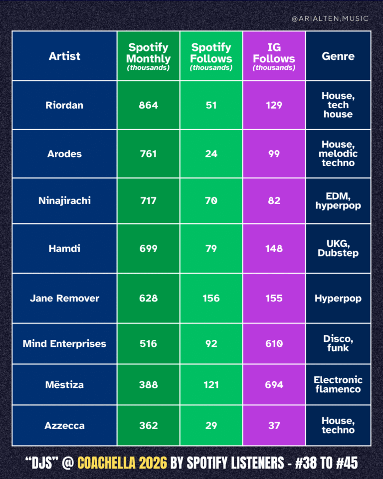 CaliforniaCoachella Coachella 2026 DJs — Data Dive: Most Have Strong Spotify & Instagram Reach October 16, 2025 View Full Post