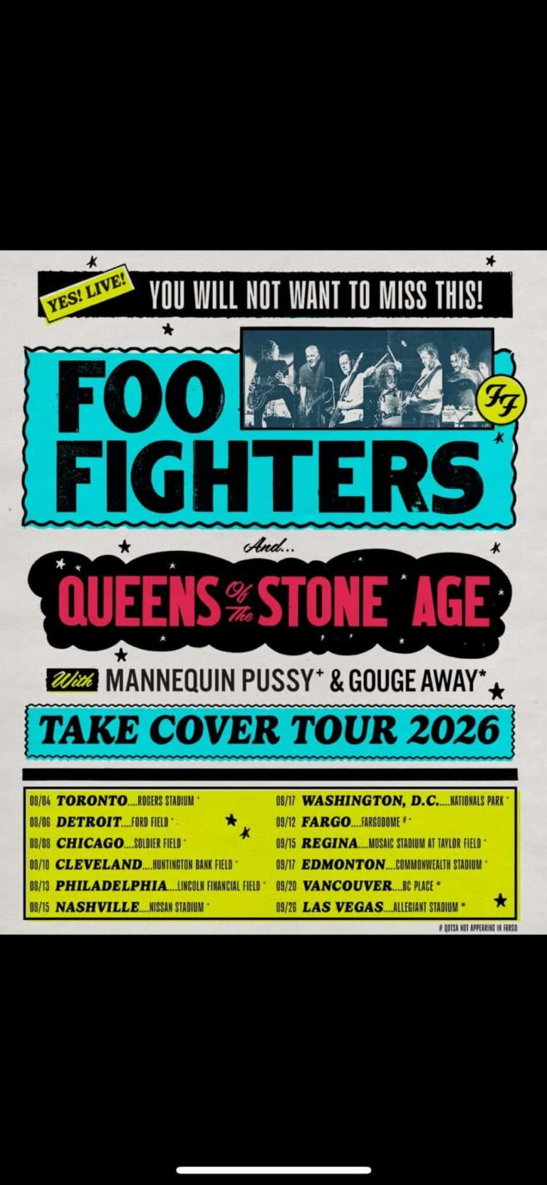 ChicagoLollapalooza Poster: Foo Fighters’ ‘Take Cover Tour 2026’ With Queens of the Stone Age — Mannequin Pussy & Gouge Away Listed October 24, 2025 View Full Post
