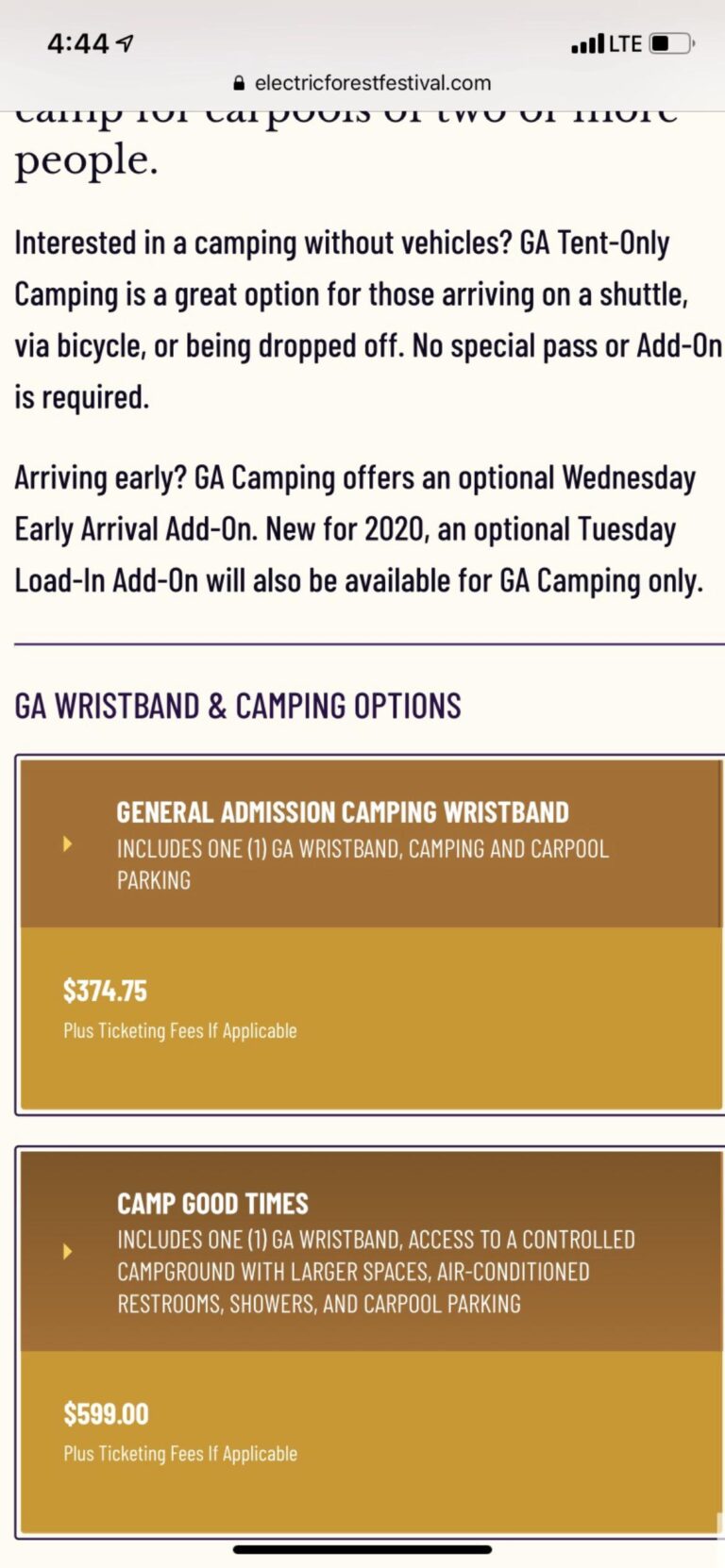 MichiganElectric Forest Found a 2020 Electric Forest ticket screenshot — GA camping $374.75, Camp Good Times $599 January 24, 2026 View Full Post